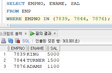 사원 번호가 7839 또는 7844 또는 7876인 사원의 번호와 이름, 급여를 출력해봅니다.