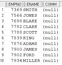 커미션이 NULL인 사원의 번호, 이름, 커미션을 출력해봅니다.