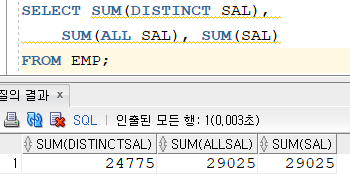 사원 테이블의 모든 사원의 급여를 SUM함수의 각각 옵션을 적용시켜 급여합을 출력해봅시다.