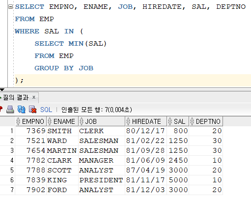 사원 테이블에서 직업 별로 최소 급여를 받는 사원의 번호, 이름, 직업, 고용일, 급여, 부서 번호를 출력해봅시다.